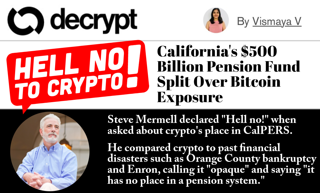 “CalPERS members earned a stable retirement—they shouldn’t have to gamble it on crypto,” said Mermell. “Retirement security should be built on smart, responsible investing – not speculation.” Continued Mermell: “Retirees shouldn’t wake up wondering if a tweet from Elon Musk just wiped out their pension.”